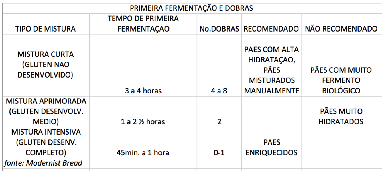 De modo geral, a mistura intensiva em um pão pouco hidratado pede uma primeira fermentação rápida, sem dobras. Do outro extremo, a mistura básica ou curta em um pão muito hidratado pede mais dobras e longa fermentação. Por exemplo, uma massa como a ciabatta ou francese, feitas com levain, mistura curta e muito hidratada (65 a 70% de hidratação) requer 2 ½ horas de primeira fermentação com 3 a 4 dobras e do outro lado, uma massa como o nosso pão francês, mais firme, com mistura intensiva e fermento biológico não necessitará de dobras.