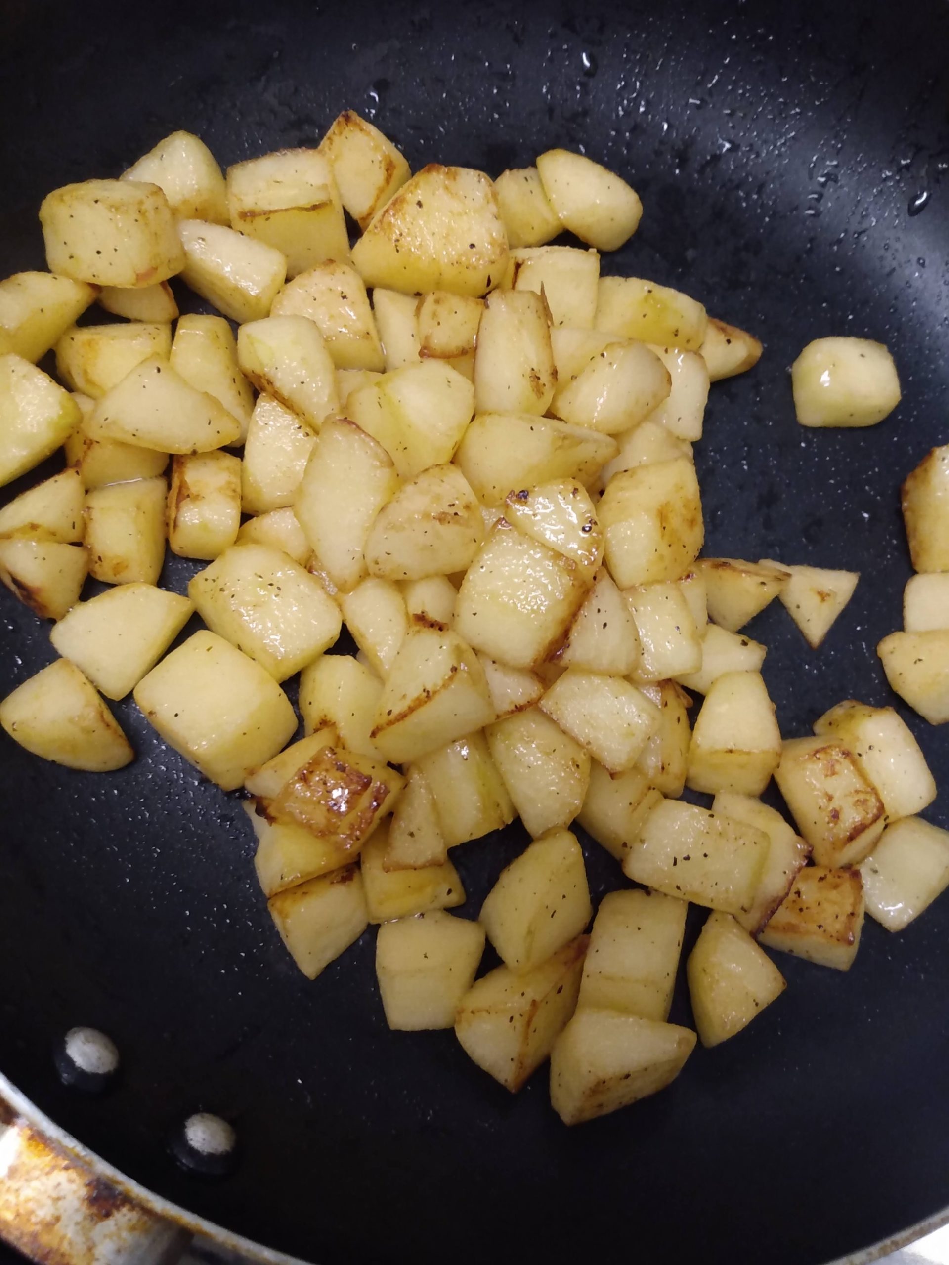 • Maçãs: devidamente lavadas e higienizadas, sem o miolo e as sementes, corte em cubos, leve a uma frigideira ao fogo, aqueça e acrescente um fio de azeite. Coloque as maçãs para caramelizar, adicionando aos pouco uma pitada de açúcar mascavo, mais azeite e deixe o açúcar dissolver. Acrescente uma pitada de sal. Quando a maçã amolecer, mas não ao ponto de ficar macia demais, retire da frigideira e reserve. Acrescente mais um fio de azeite e a pimenta moída (a gosto).