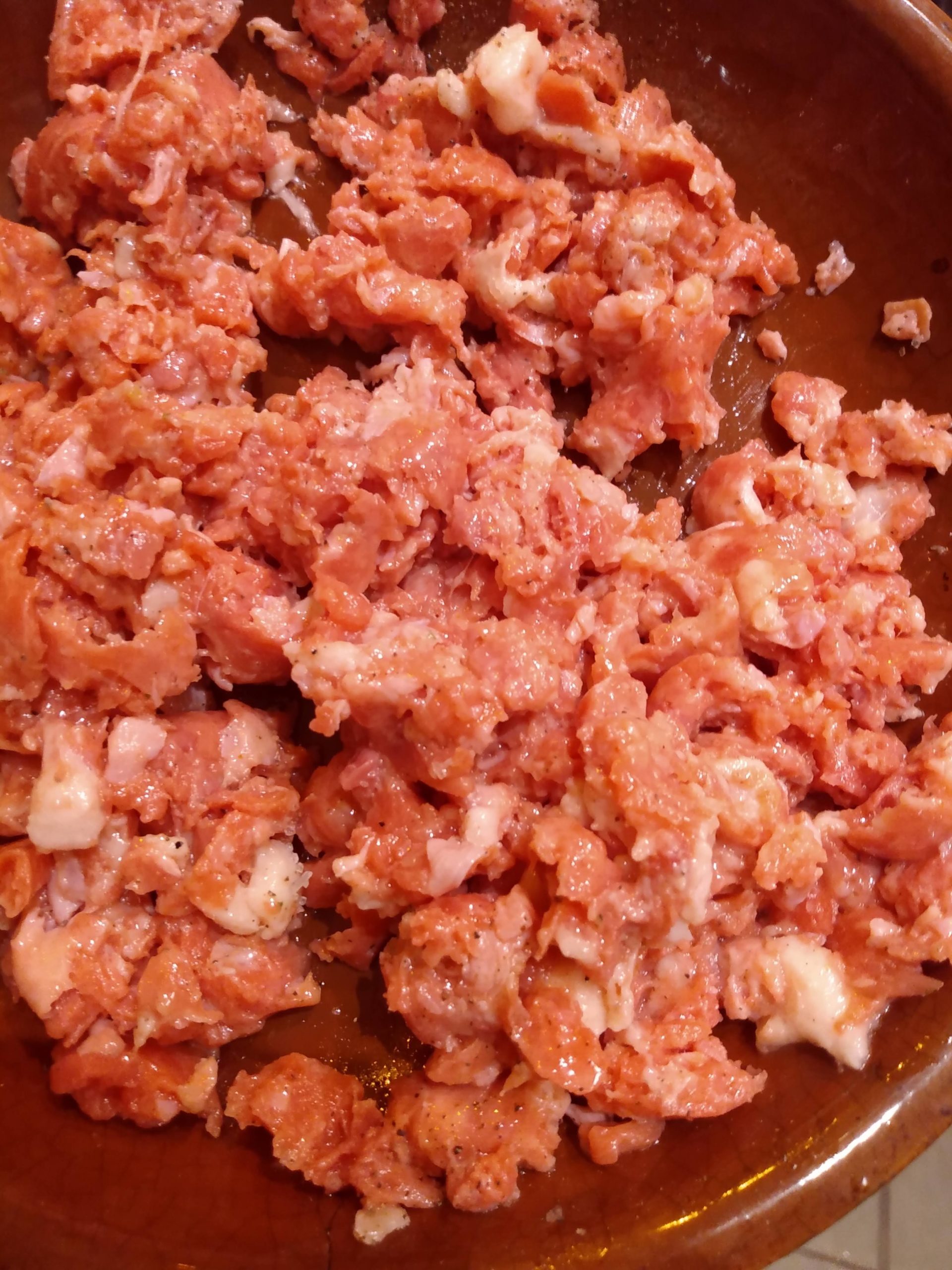 • Linguiça; com auxílio de uma faca retire a carne da linguiça, depois regue com azeite, sal e pimenta leve ao fogo médio para dar uma desidratada e retirar o excesso de liquido, tenha atenção para não desidratar demais lembre-se que depois ela vai voltar ao forno.